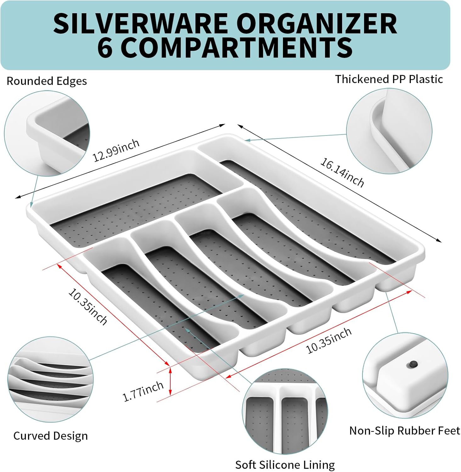 - 6-Compartment Drawer Organizer – Universal Fit & Non-Slip Design Thickened PP plastic stainless steel drawer organizer tray (16.14L x 12.99W) fits most kitchen drawers. 6 adjustable compartments securely hold stainless steel cutlery sets. knives. spoons. and forks with soft silicone lining. Non-slip rubber feet prevent sliding – perfect for organizing heavy duty stainless steel flatware or kitchen utensils.