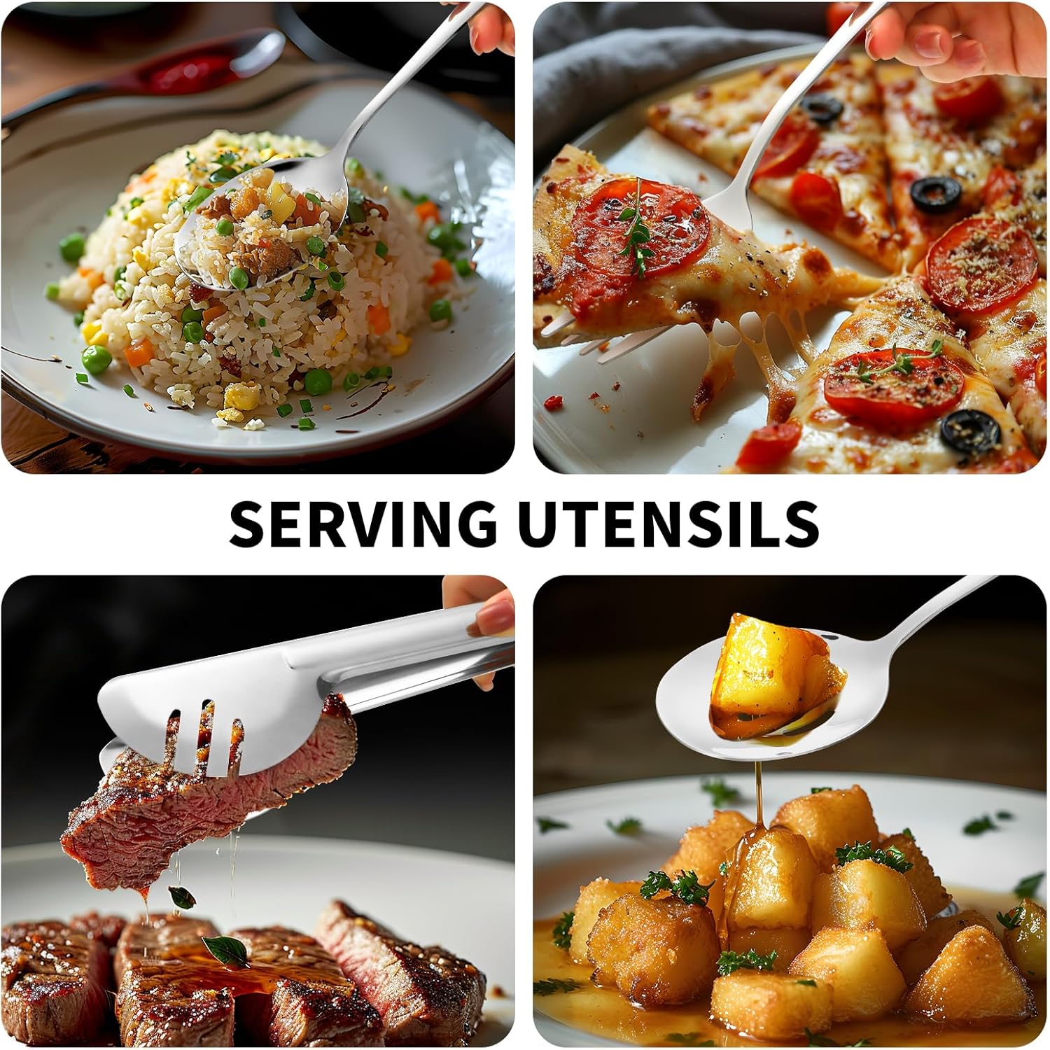 - Pro-Grade Serving Tools – From BBQ to Buffets 4 versatile stainless steel serving utensils handle every task: Tongs for burgers/salads. slotted spoon for straining. solid spoon for sauces/desserts. and fork for carving. Weighted handles prevent fatigue during long dinners – essential for hosting fancy meals.